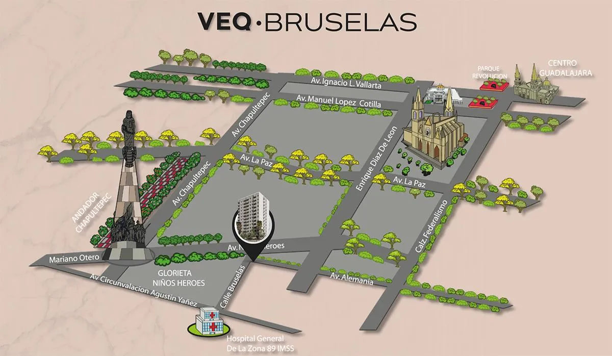 Bruselas es un desarrollo inmobiliario vertical de Grupo VEQ ubicado en la Colonia Moderna de Guadalajara, una zona con gran tradición y a la vez en transformación moderna. Consta de una torre de 108 unidades, distribuidas en departamentos de 1 y 2 recámaras, diseñados para quienes buscan un estilo de vida cómodo, funcional y bien conectado.